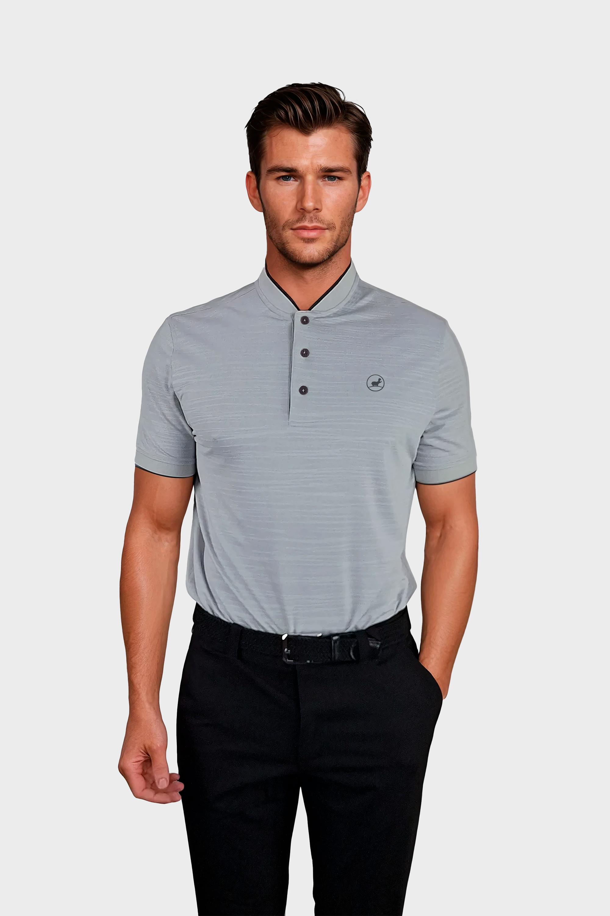 Sleek and stylish WBChris golf polo shirt in grey. The bomber collar adds a touch of sophistication while the lightweight material offers comfort and mobility. Perfect for those looking for a stylish and fresh look on and off the course.