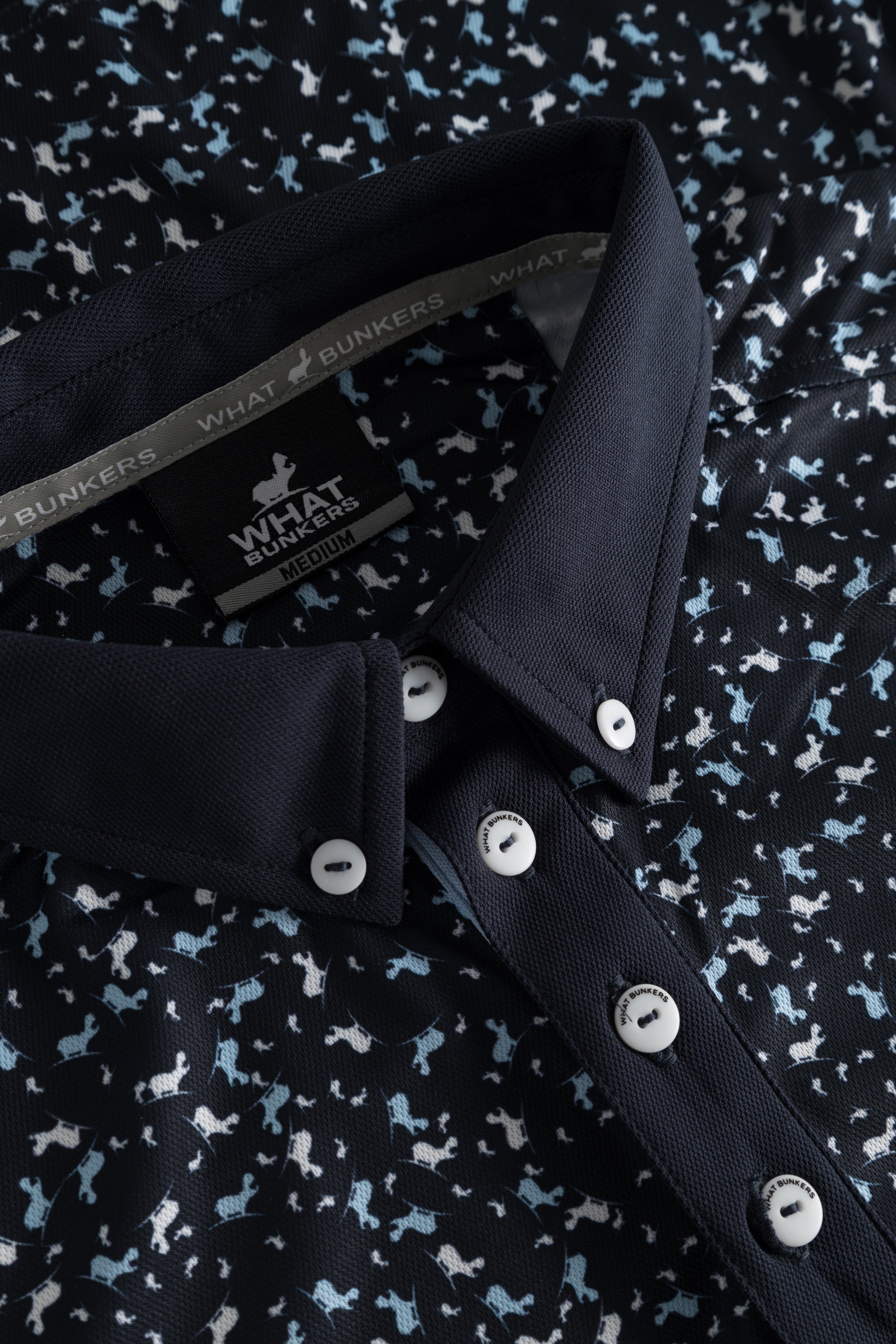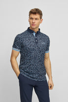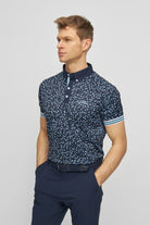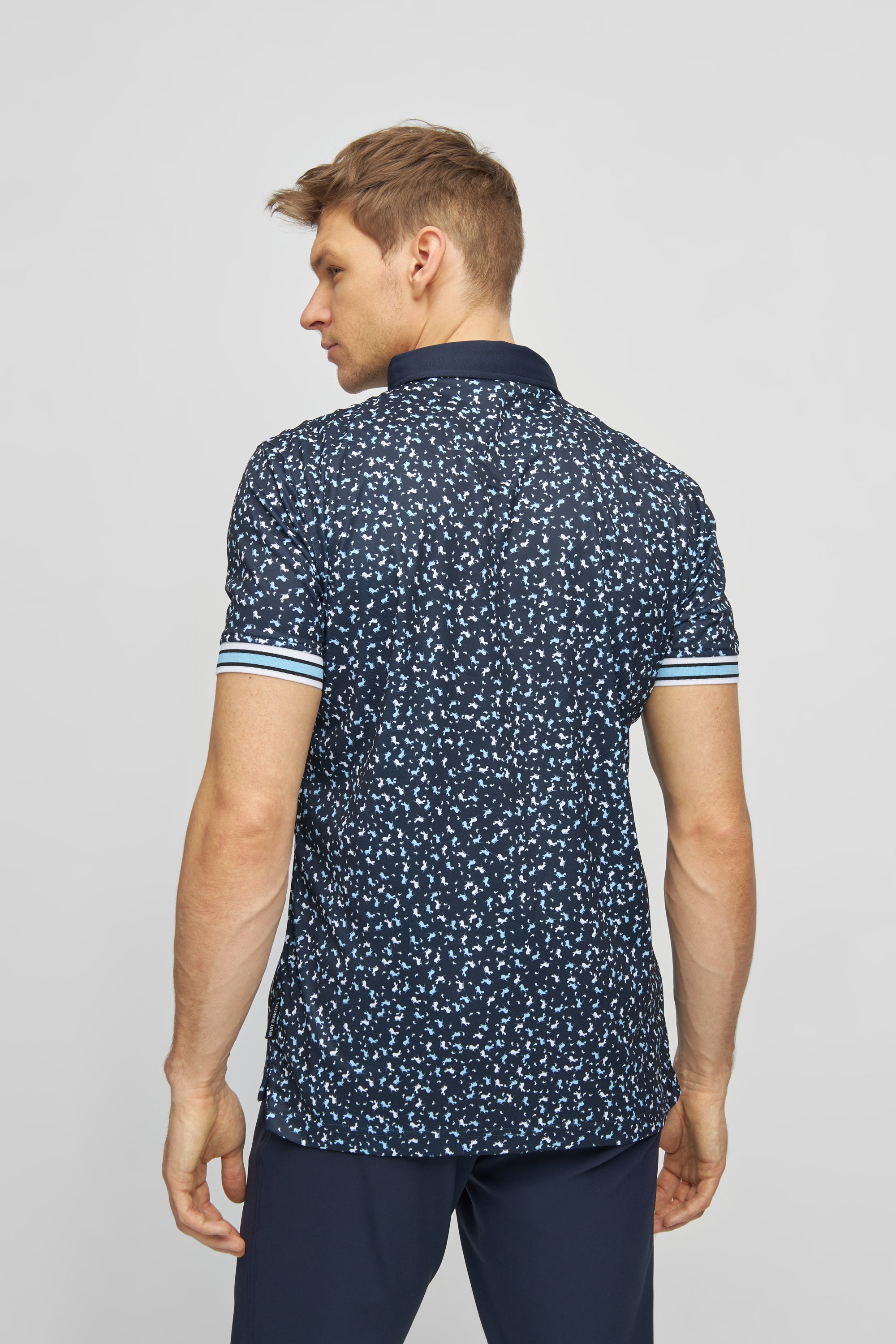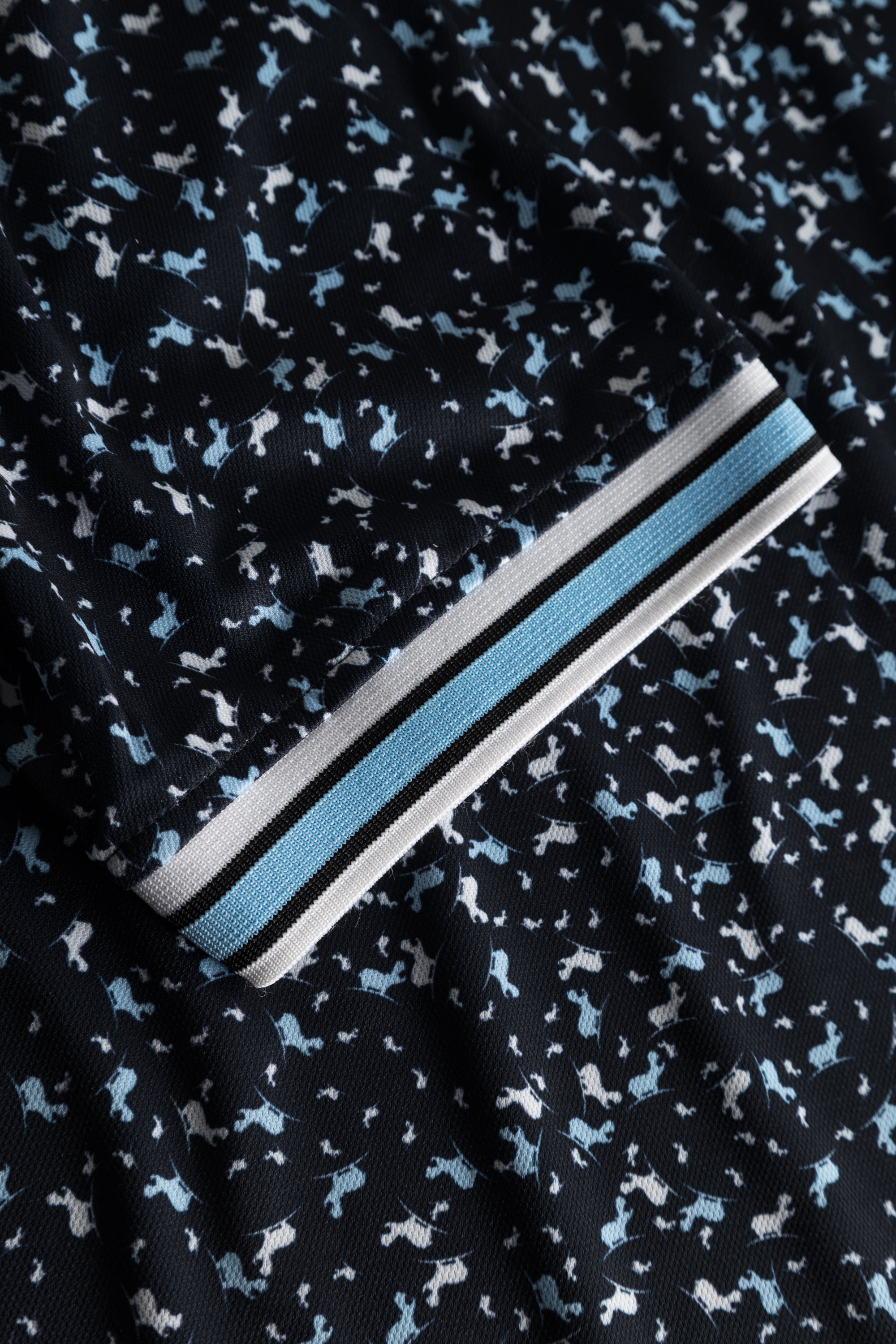 Cool and classy golf polo shirt for men. Rib cuffs and an allover Hippo print. From a distance the pattern looks random - closeup you will find the Hippo in different colors and sizes scattered all over the shirt.