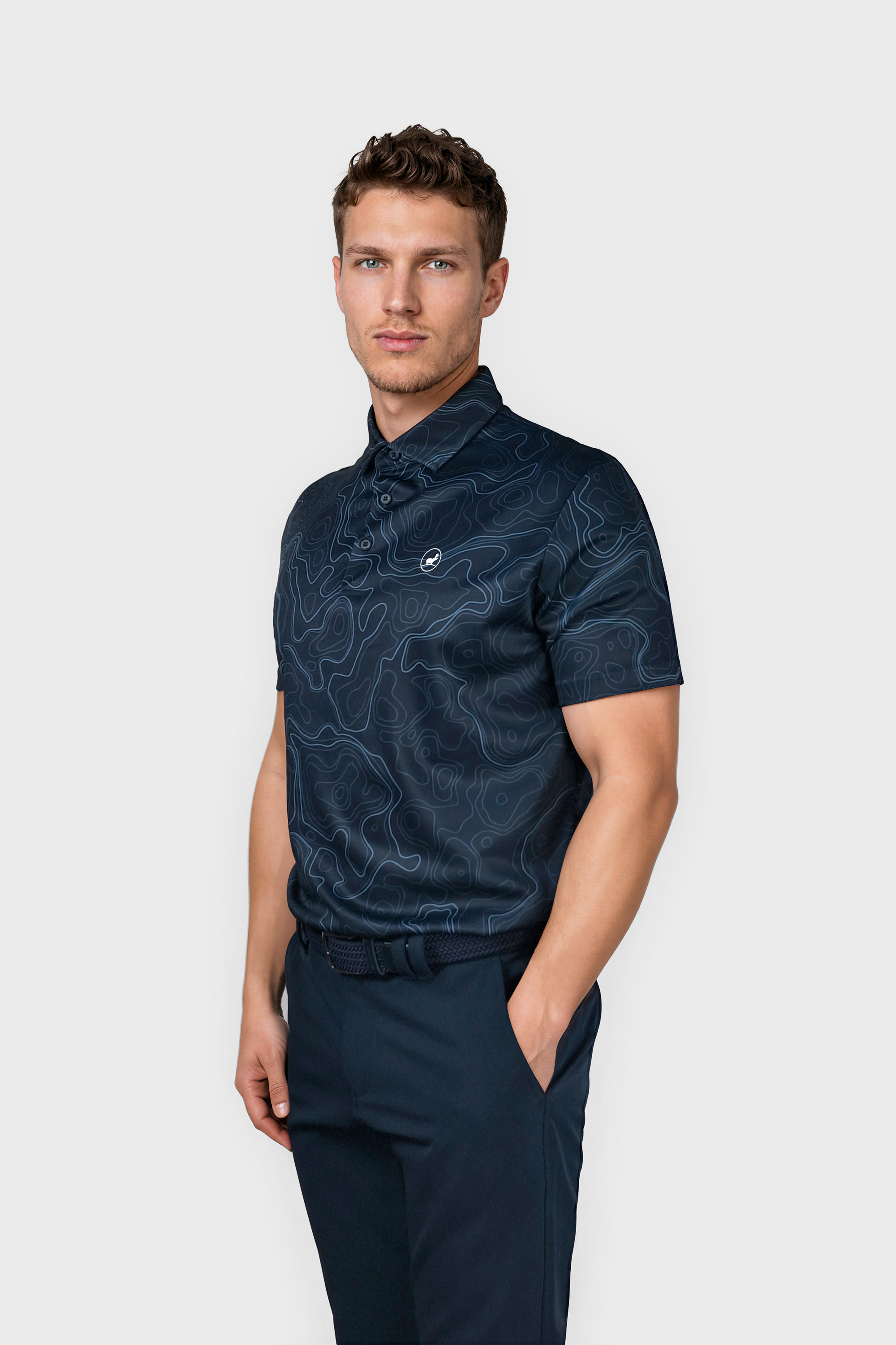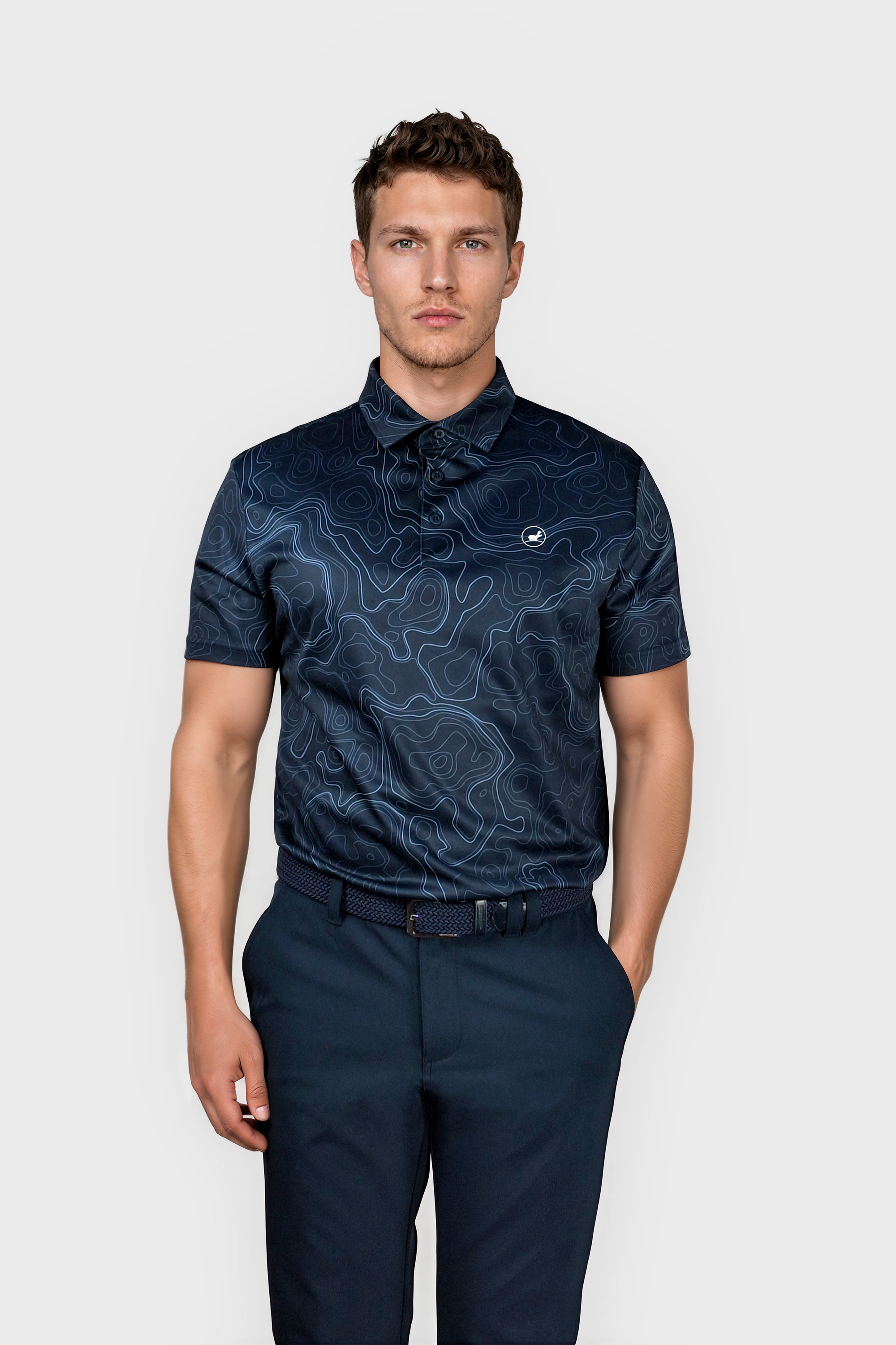 Cool and classy golf polo shirt for men. Allover contour plan print.
